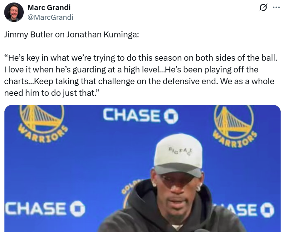 正如巴特勒所说,库明加开季表现太出色了,已经成为勇士队攻防两端努力实现目标的关键人物,全队都需要他保持这样的状态。