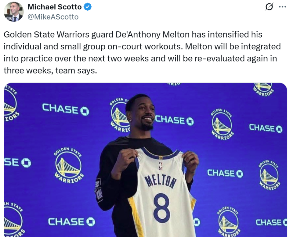 更重要的是,勇士队未来还将继续提升阵容深度,根据记者Michael Scotto报道,勇士休赛期签下的另外一名重要新援梅尔顿伤病恢复迎来突破。
