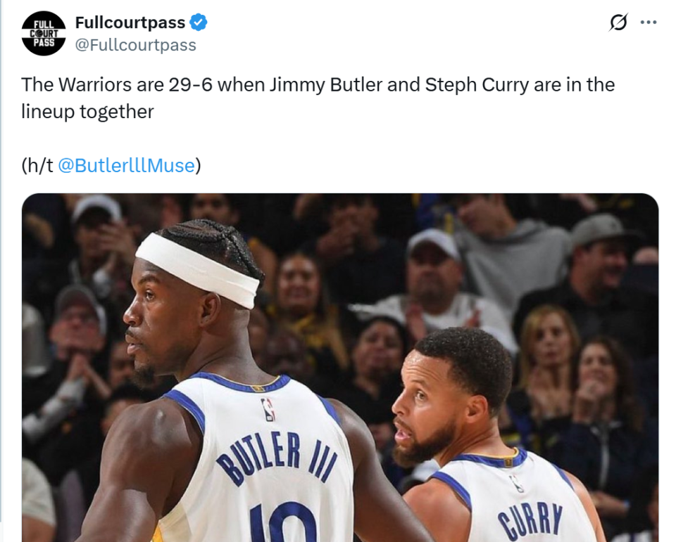 开赛至今,库里与巴特勒均保持着顶级比赛影响力,并且打出无解的库巴挡拆配合,自从联手以来当库里与巴特勒同时出战时,勇士队拿到29胜6负战绩,胜率高达83%。
